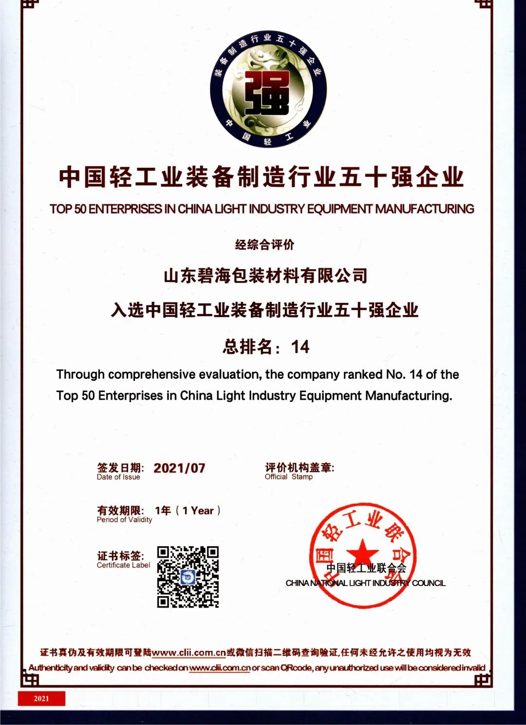 2021年7月20日,在北京召开的“奋进‘十四五’领航新消费”中国轻工业百强企业高峰论坛上,碧海公司入选中国轻工业装备制造行业五十强企业(排名14)、中国液态食品机械行业十强企业(排名4),这是对我公司综合实力、创新成就的高度肯定和认可。