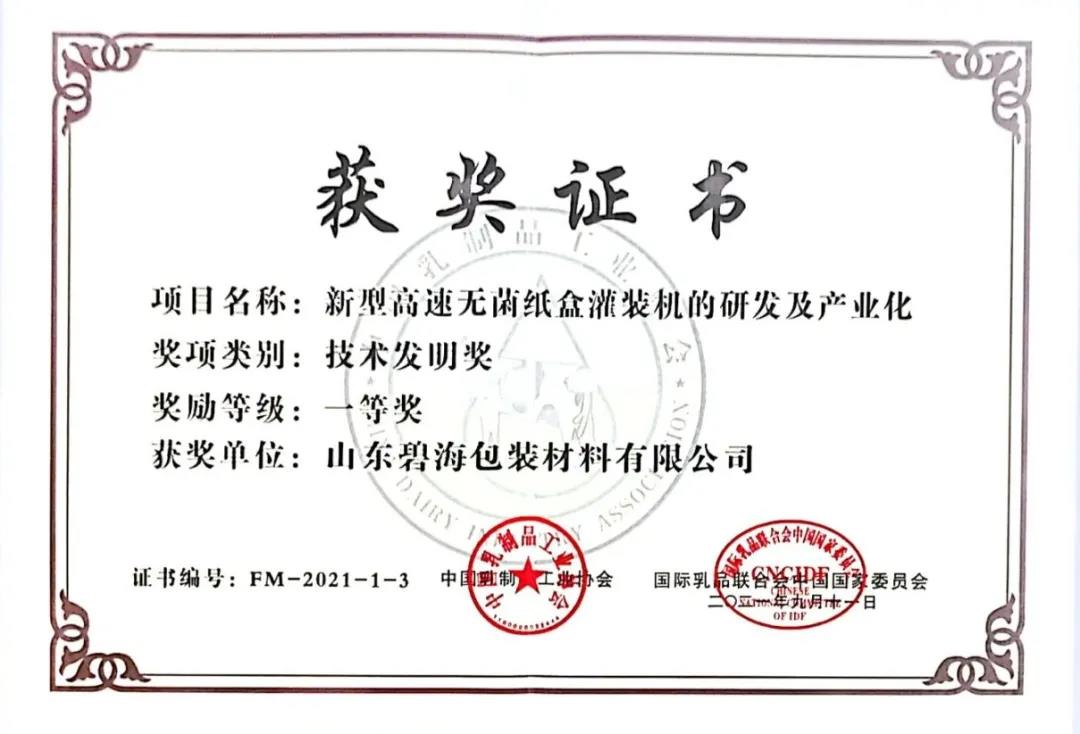 11日,在2021年度中国乳业科技系列颁奖盛典上,碧海包装又一新型高速无菌纸盒灌装机获技术发明奖一等奖,公司执行总经理王立上台接受颁奖。
